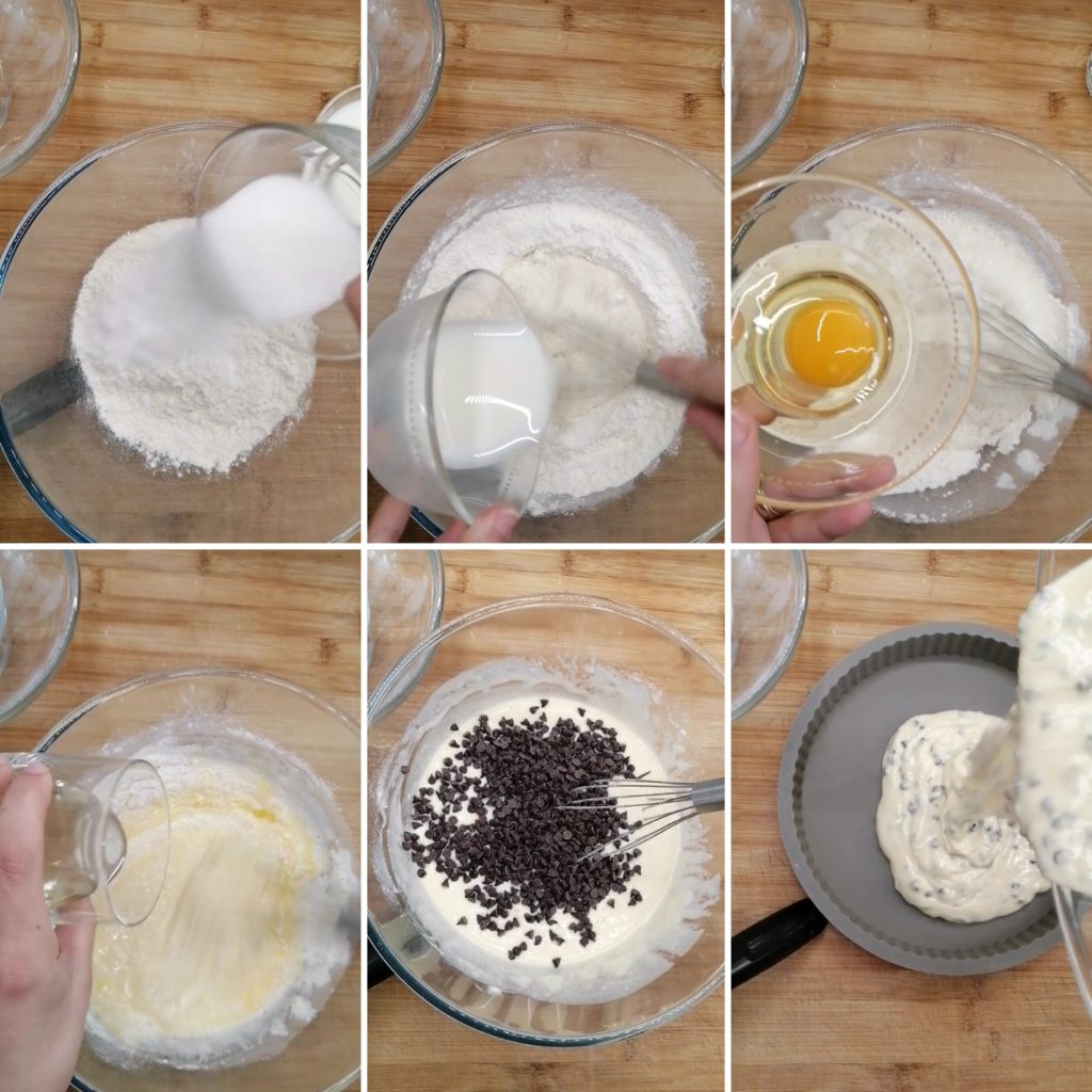 Als alle ingrediënten goed zijn gemengd en er geen klontjes meer zijn, voeg dan de pure chocoladestukjes toe en meng ze voorzichtig met een spatel.