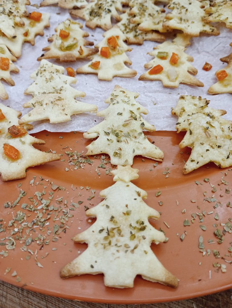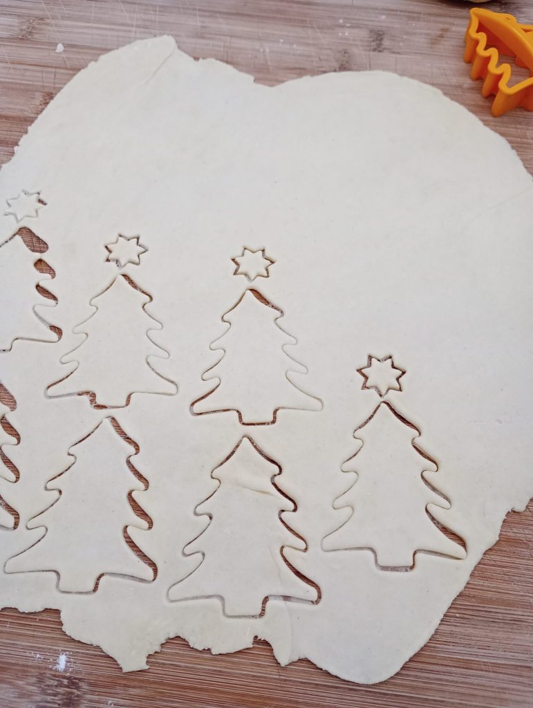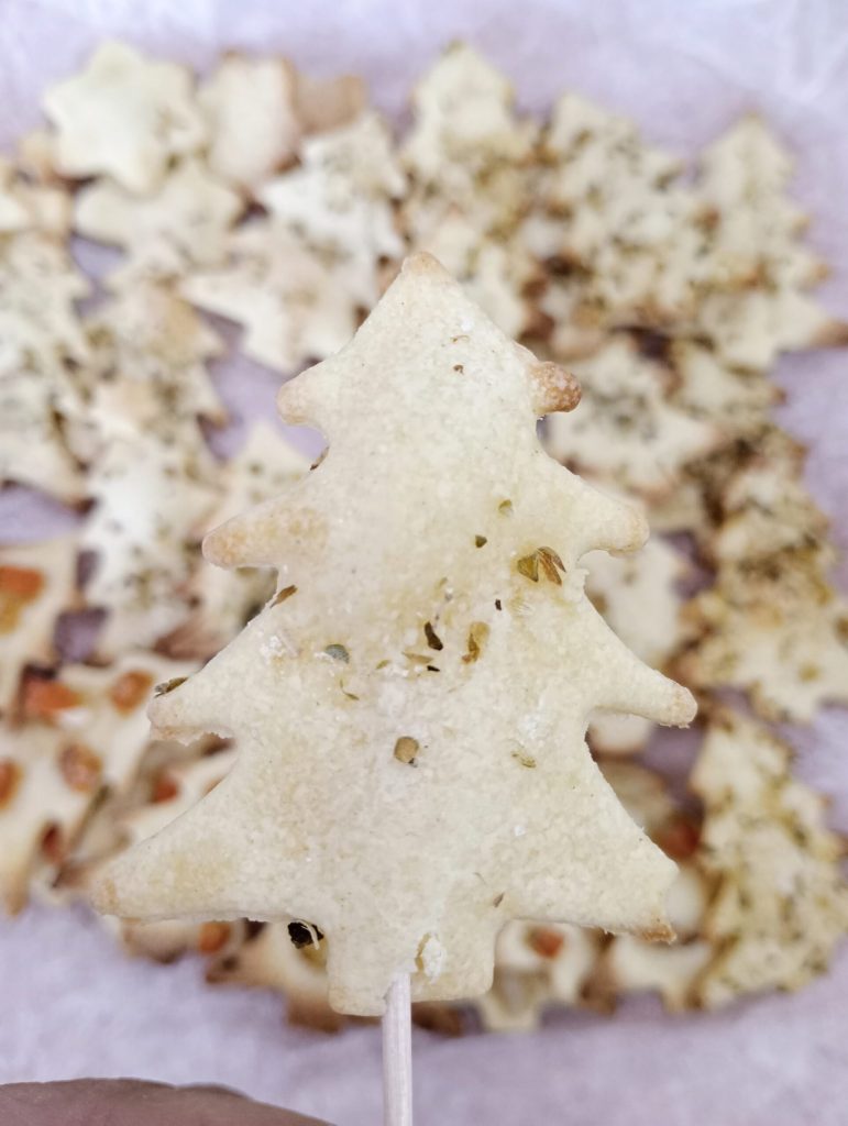 Na de rusttijd het deeg in twee delen en begin heel dun uit te rollen, vorm de vormen. Leg deze op een met bakpapier beklede bakplaat en bestrijk de kerstboompjes met wat olijfolie, decoreer naar smaak met oregano, paprika, worteltjes of wat je maar wilt.