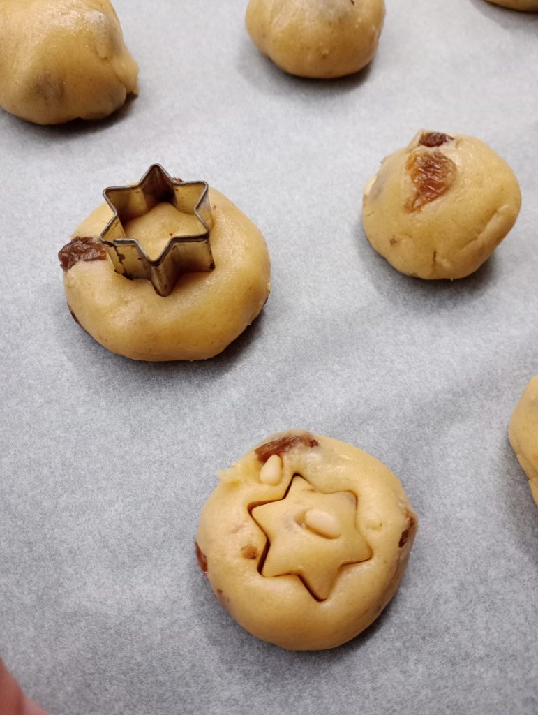 Ze zijn heel eenvoudig te maken: het deeg is in een minuut klaar en dan hoef je alleen maar eenvoudige balletjes te maken, ze op een bakplaat te leggen en ze lichtjes plat te drukken met een vormpje of met je handen.