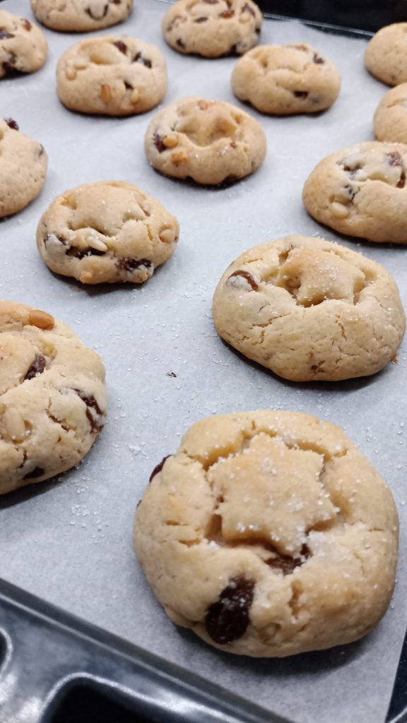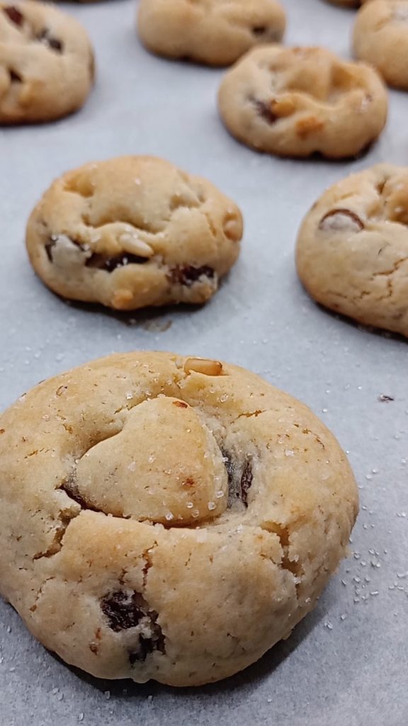 Deze koekjes veroveren door hun eenvoud en lekkernijen, dankzij de toevoeging van de zoetheid van de rozijnen en de knapperigheid van de pijnboompitten. Ze zijn een klein meesterwerk van smaken en texturen.