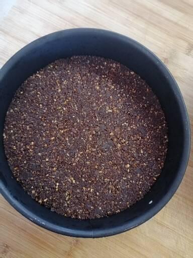 Eerst de koekjes verkruimelen, in een mixer of in een plastic zakje waar je met een deegroller overheen gaat. Doe de verkruimelde koekjes in een kom.