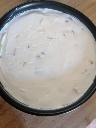 Neem de vorm en giet de room erin bovenop de koekjesbodem, maak het glad en zet in de koelkast.