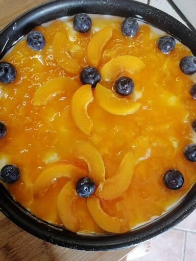 Haal van het vuur en laat afkoelen. Haal de taart uit de koelkast en giet het abrikozenmengsel over de bovenkant, maak het voorzichtig glad met een lepel. Ik heb ook versierd met abrikozenpartjes en bosbessen. Zet minimaal 4 uur in de koelkast (hoe langer, hoe beter)