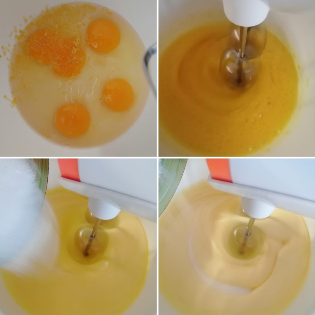 Giet in een kom de 4 eieren met een snufje zout en de geraspte citroenschil, klop ze met de mixer gedurende 5 minuten, zodra deze tijd is verstreken, begin de suiker beetje bij beetje toe te voegen. Vergeet niet dat deze stap belangrijk is, de suiker moet in drie keer worden toegevoegd. Laat de mixer nog 10 minuten werken