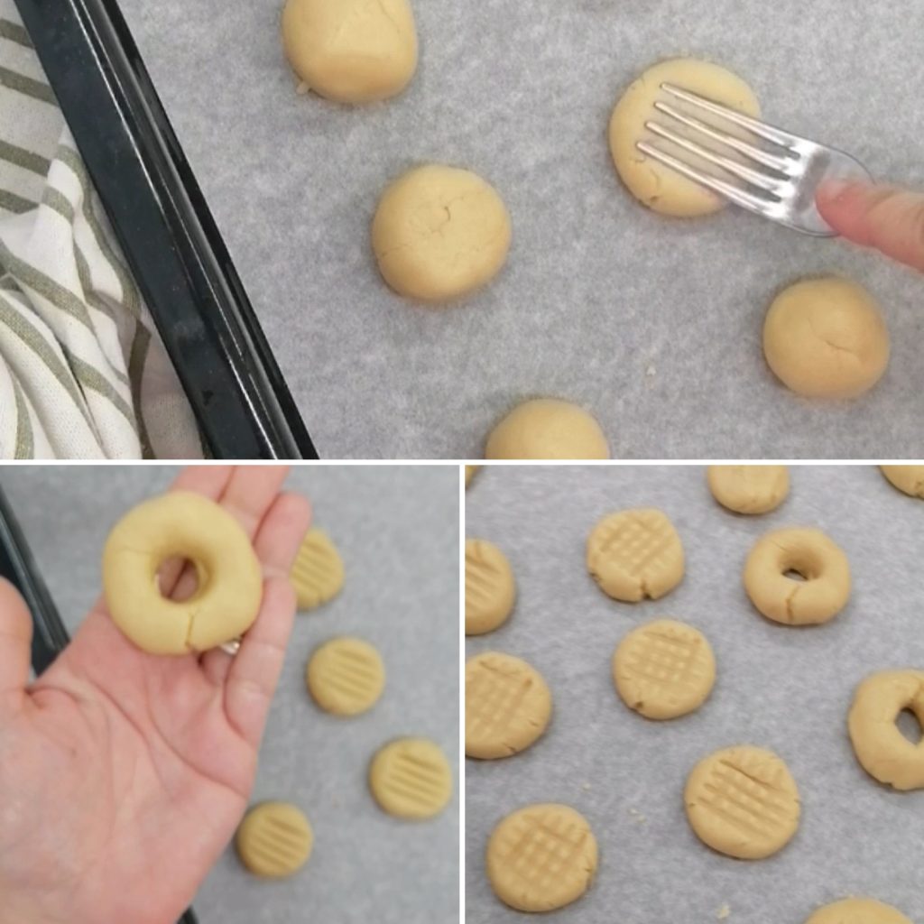 Maak balletjes of ringetjes, door een balletje te maken en met de vinger een gat in het midden te maken.