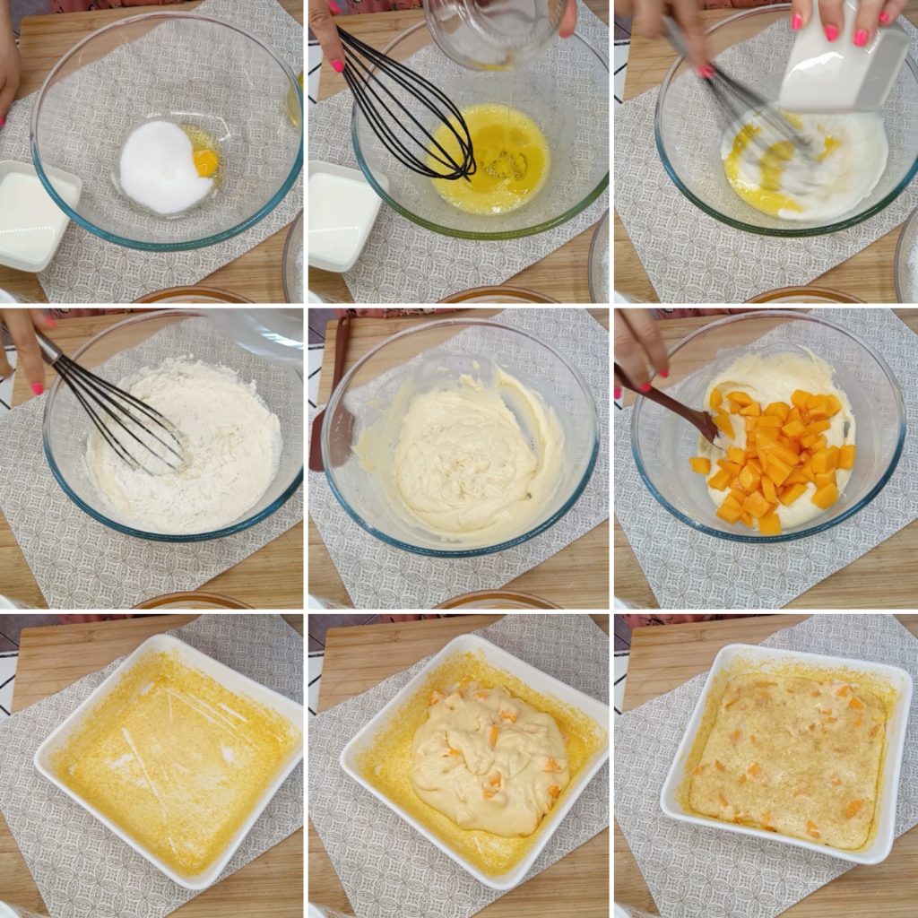 Nadat het gemengd is, voeg voorzichtig de in stukjes gesneden meloen toe (zorg ervoor dat ze niet te groot zijn). Meng en giet het deeg in een vorm (bijvoorbeeld een vierkante van 20×20 cm). Boter en bloem de vorm, of gebruik paneermeel in plaats van bloem voor het gewenste effect.