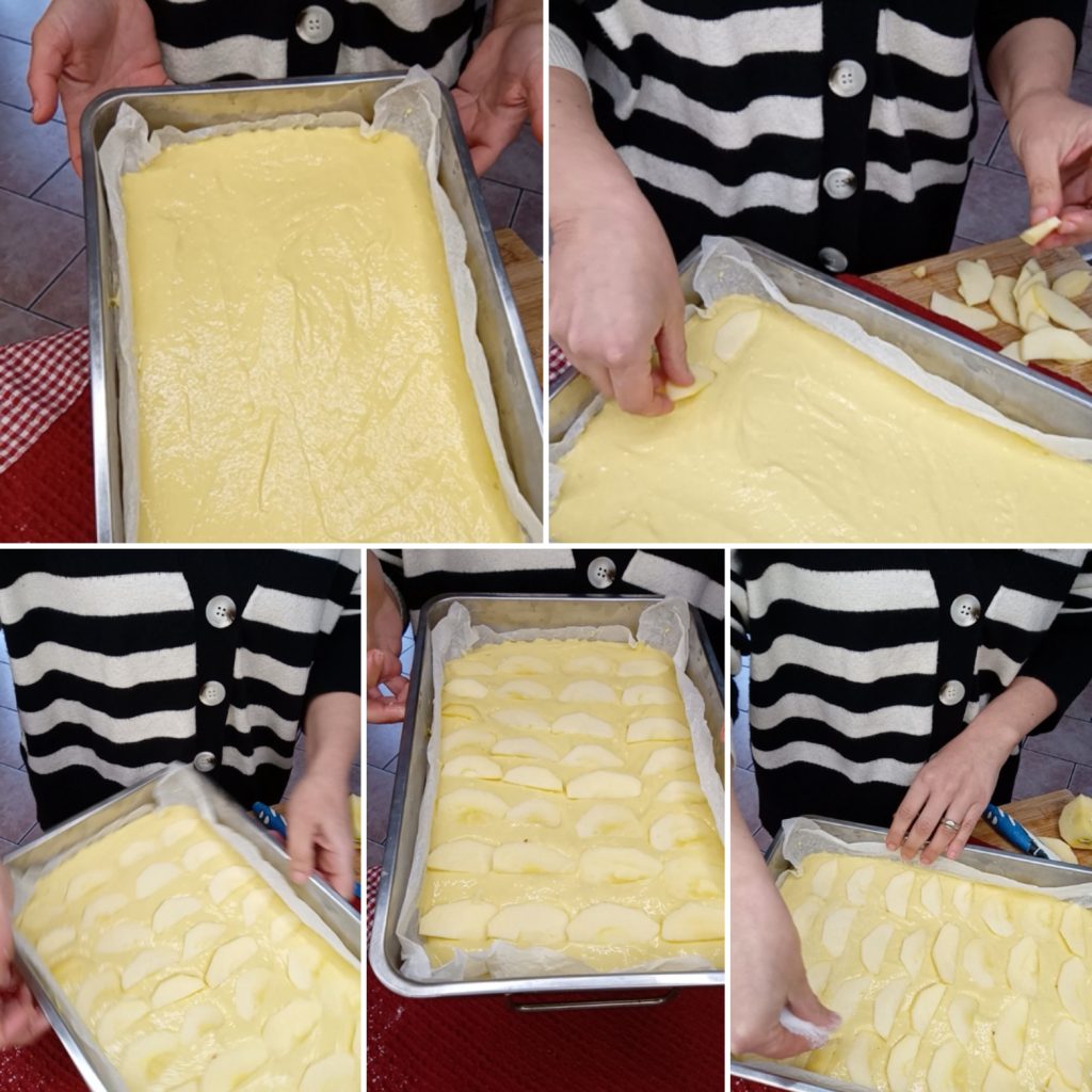 Schil de appels en snijd ze in dunne plakjes en leg ze bovenop het deeg. Bak in een voorverwarmde statische oven op 180 graden gedurende 25-30 minuten, na 25 minuten doe de tandenstokertest, als deze droog is, haal dan de ricotta en appelcake uit de oven.
