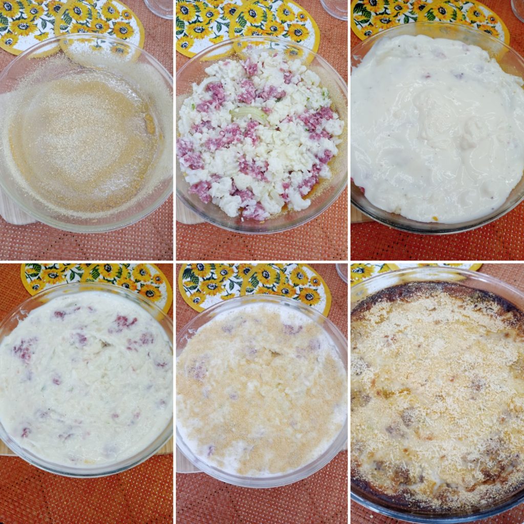 Meng in een kom de bloemkool, de worst en ongeveer tweederde van de bechamelsaus. Meng goed.