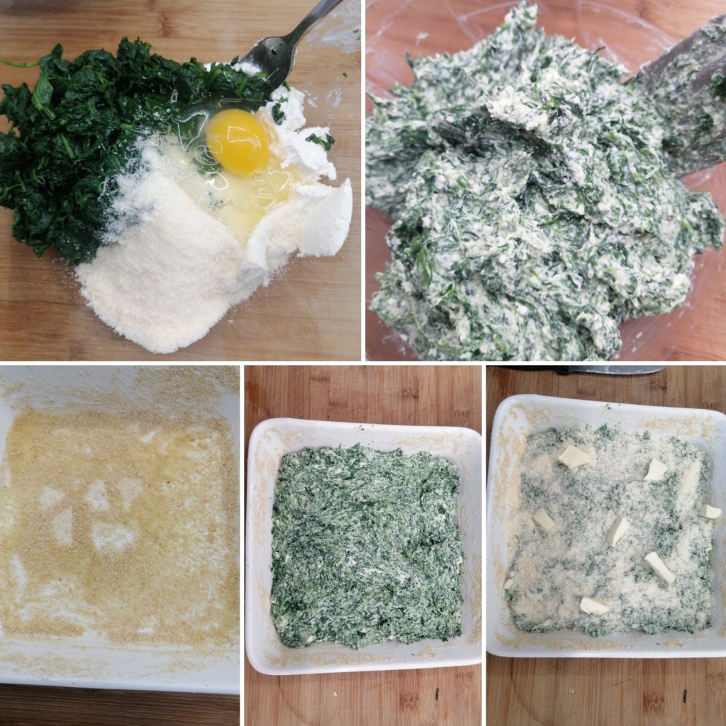 Kook eerst de spinazie enkele minuten in gezouten kokend water, giet ze af en laat ze afkoelen. Zodra ze afgekoeld zijn, knijp ze met je handen om al het water eruit te halen.