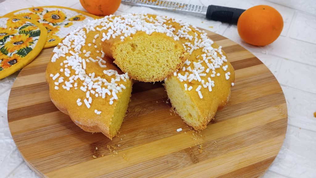 Ondertussen giet je het sinaasappelsap in een pannetje samen met een eetlepel suiker. Zet het op laag vuur en laat de suiker goed oplossen.Wanneer de siroop klaar is, gebruik een kwastje of een lepel om het hele oppervlak van de cake te bestrijken en voeg direct de suikerkorrels toe, als je dat lekker vindt, zodat ze perfect blijven plakken dankzij de nog warme siroop.