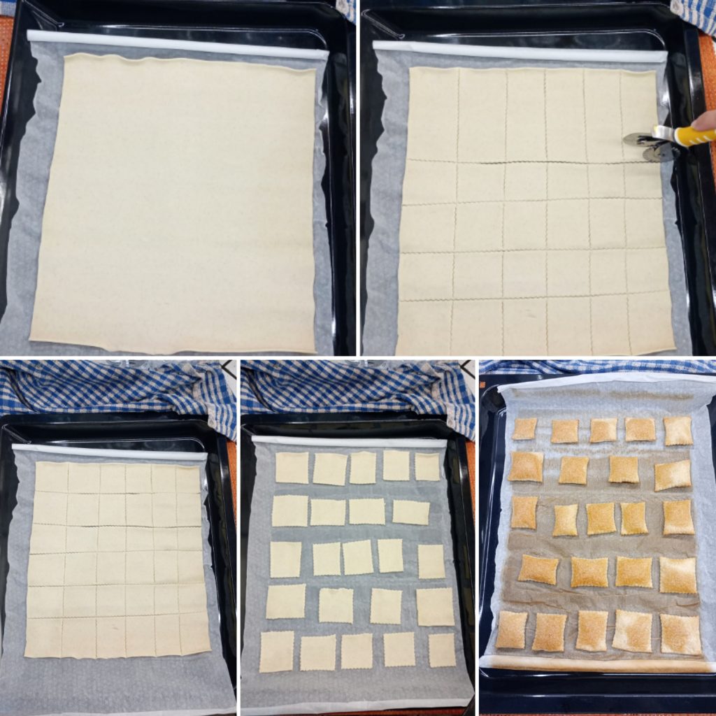 Laat ruimte tussen de stukken en bak op 180 graden voor ongeveer 15 minuten of tot ze goudbruin zijn. Tijdens het bakken zullen ze opblazen als kleine ballonnetjes.