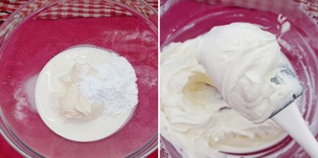 Zorg ervoor dat de verse slagroom goed koud is… (je vindt het in het koelschap van de supermarkt) en haal het pas op het laatste moment uit de koelkast.