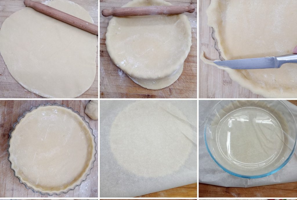 Rol het deeg vrij dun uit en leg het in een ingevette en met bloem bestoven vorm van 24-26 cm diameter, snijd de randen bij.