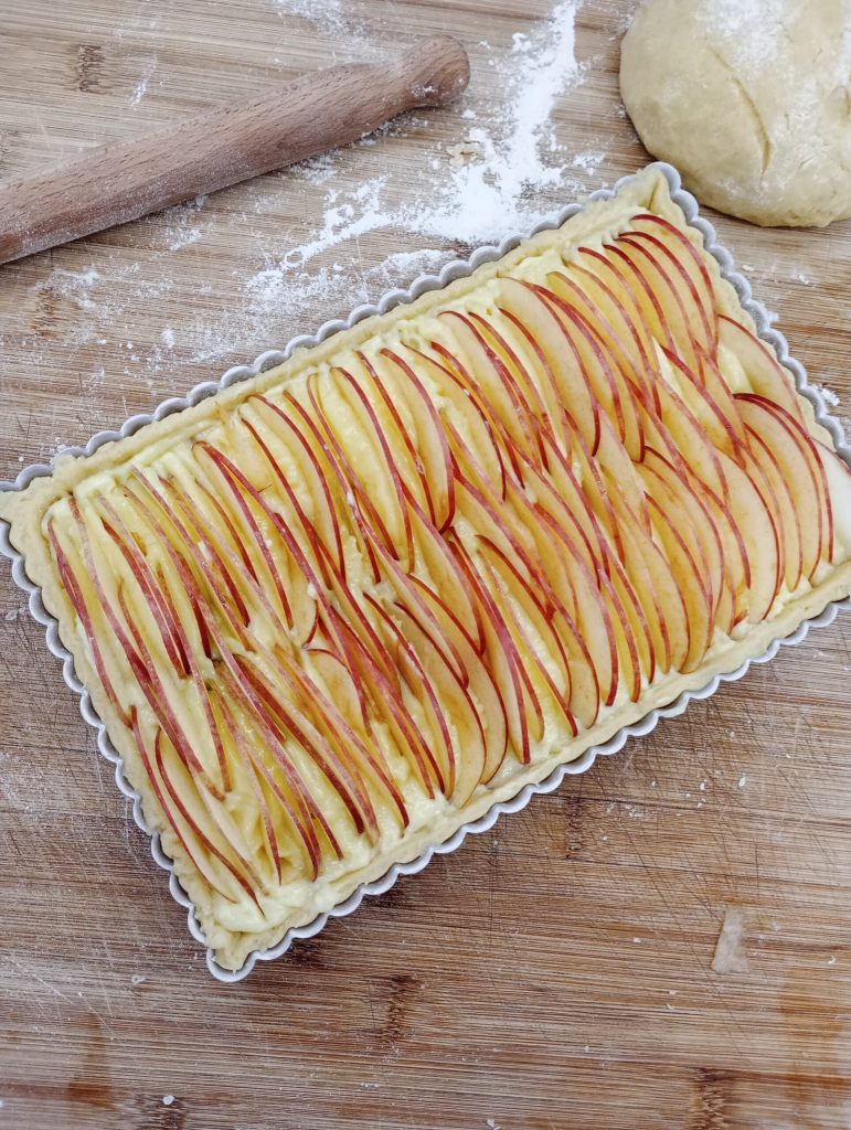 De zachte deegbodem bevat een heerlijk banketbakkersroom, en op de bovenkant heb ik veel schijfjes appel gelegd. Het resultaat is een geurig en krokant dessert, met een zachte korst en een echt heerlijke vulling.