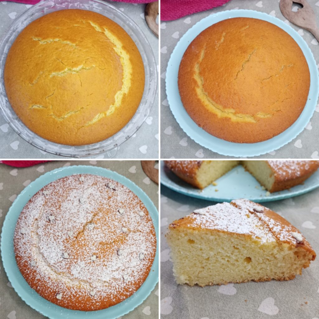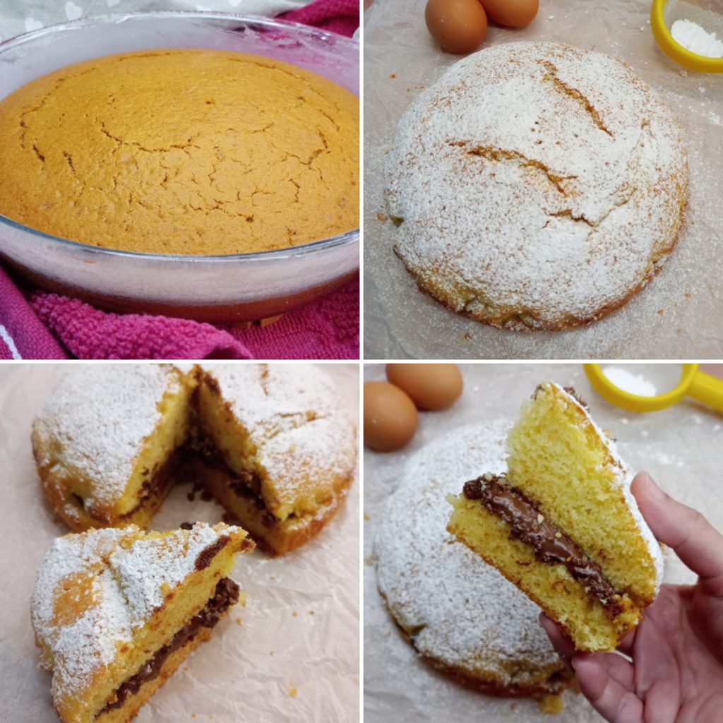 Zodra de cake volledig is afgekoeld, kun je ervoor kiezen om deze zo te laten, hem met poedersuiker te bestrooien of doormidden te snijden, zoals je op de onderstaande foto ziet, en hem te vullen met hazelnootpasta of wat je maar wilt.