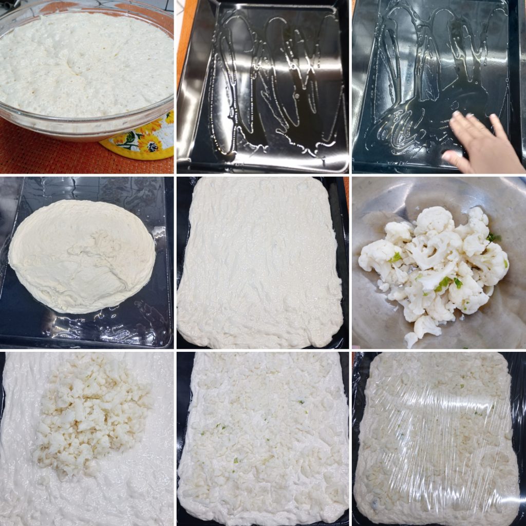 Eenmaal uitgespreid, garneer met de bloemkool (die al eerder is gekruid) en verdeel gelijkmatig. Dek de bakplaat opnieuw af met de folie en laat nog een uur rijzen.