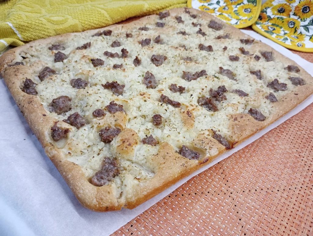 Ik heb deze ongelooflijke Witte Pizza met Bloemkool en Worst gemaakt, een rustieke en smaakvolle combinatie die de zoetheid van bloemkool combineert met de hartigheid van worst.