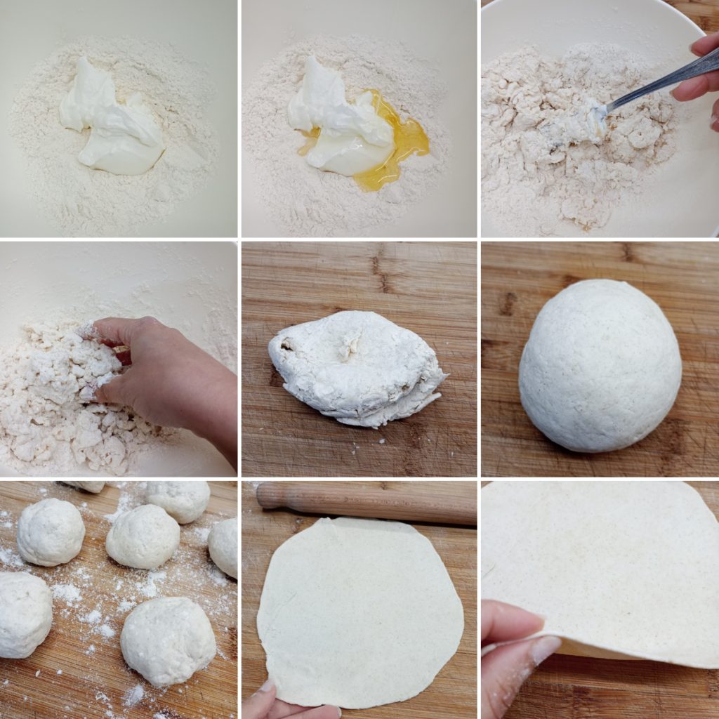 Giet in een kom de bloem, de yoghurt, de olie en een snufje zout en meng met een vork.