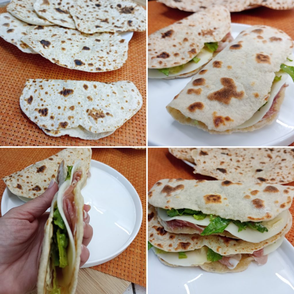 De yoghurt piadine zijn klaar om van te genieten. Ik heb deze lekkernijen gevuld met rauwe ham, provola en sla en andere met stracchino en rucola.