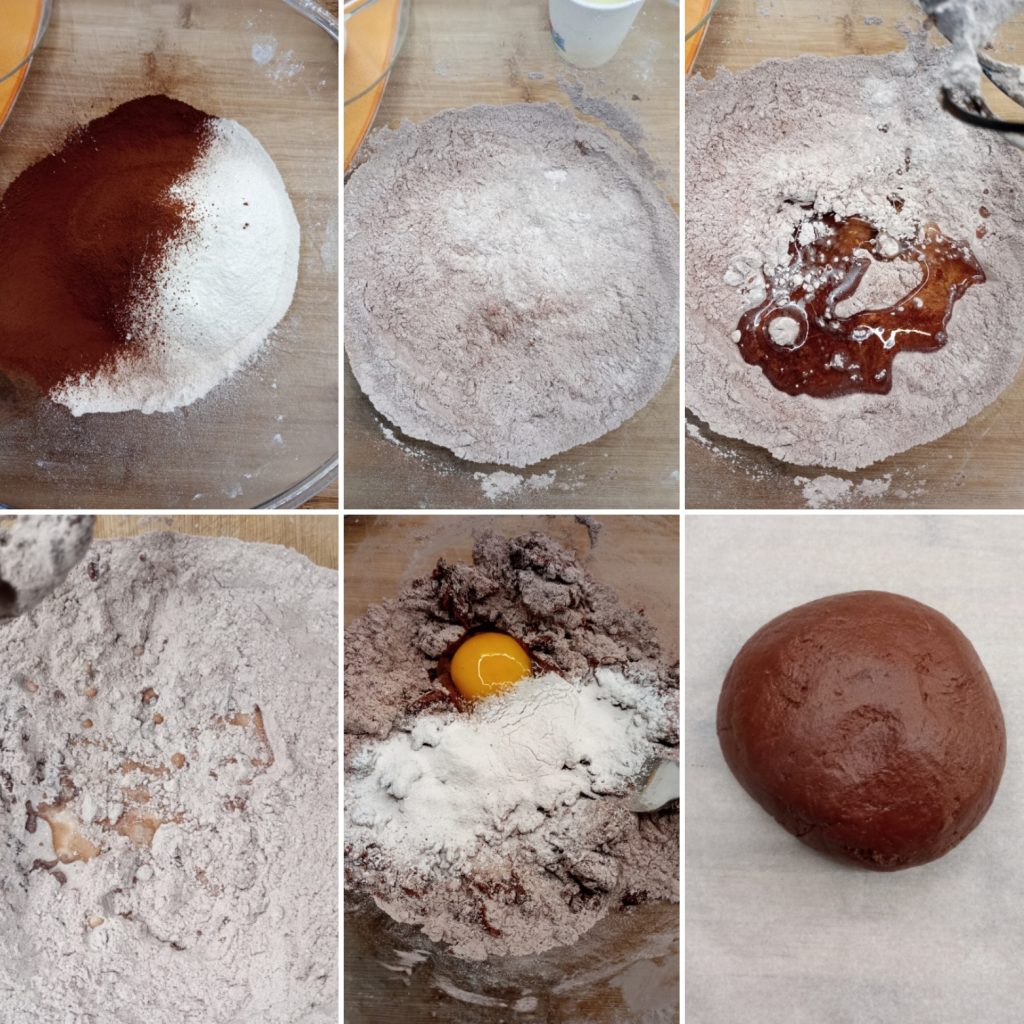 zeef in een kom de bloem, het ongezoete cacaopoeder en de poedersuiker en meng. Voeg de olie toe en daarna ook de melk, meng deze laatste twee ingrediënten en voeg het ei en het gezeefde bakpoeder toe. Kneed met de handen tot een zacht maar homogeen deeg.