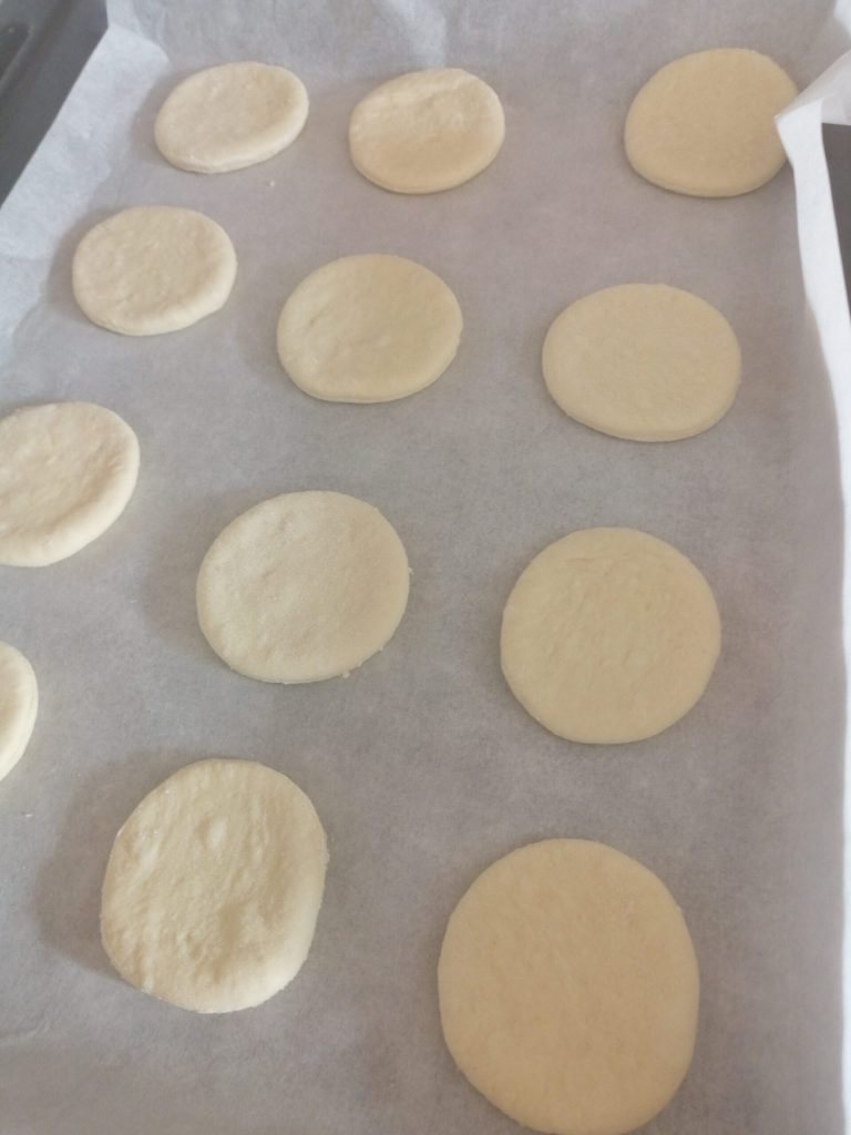 Na de twee uur het deeg uitrollen op een met bloem bestoven werkblad en de platte broodjes uitsteken met een glas of een steekvorm