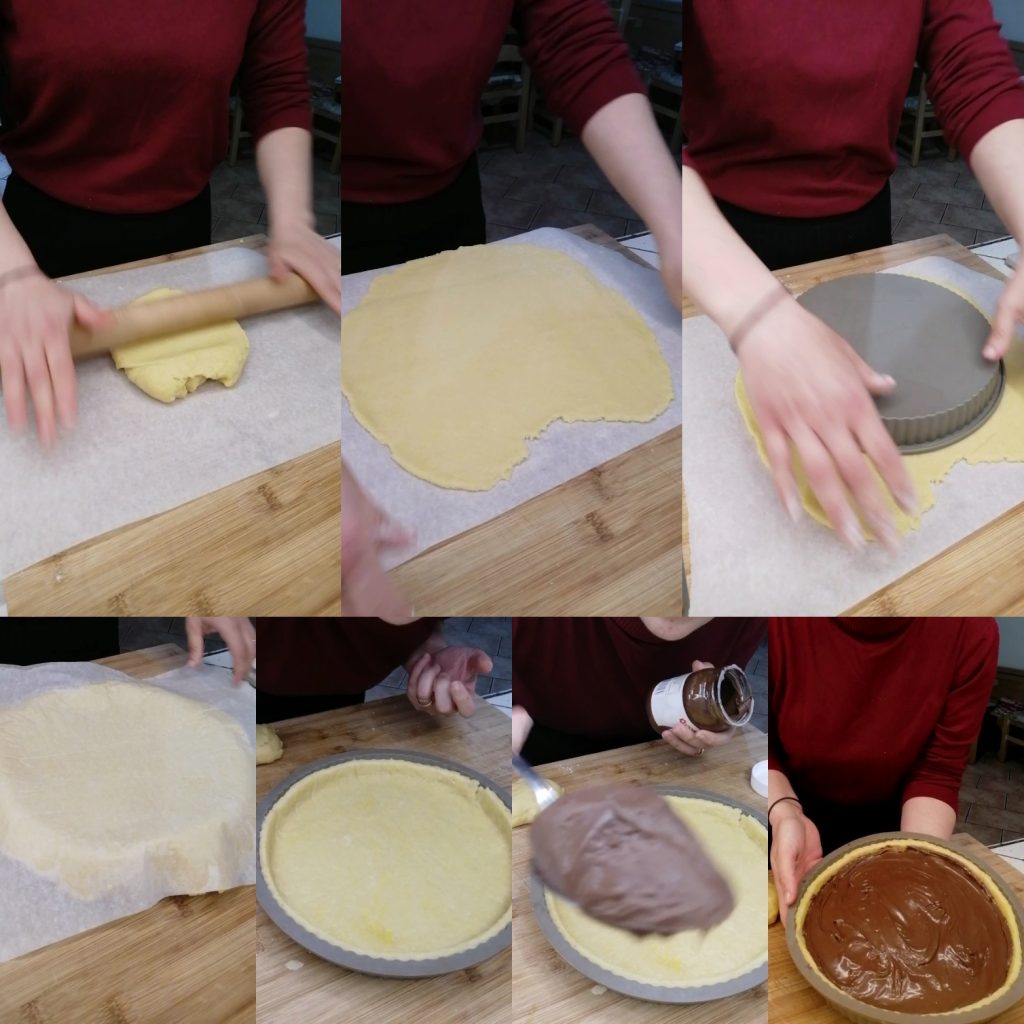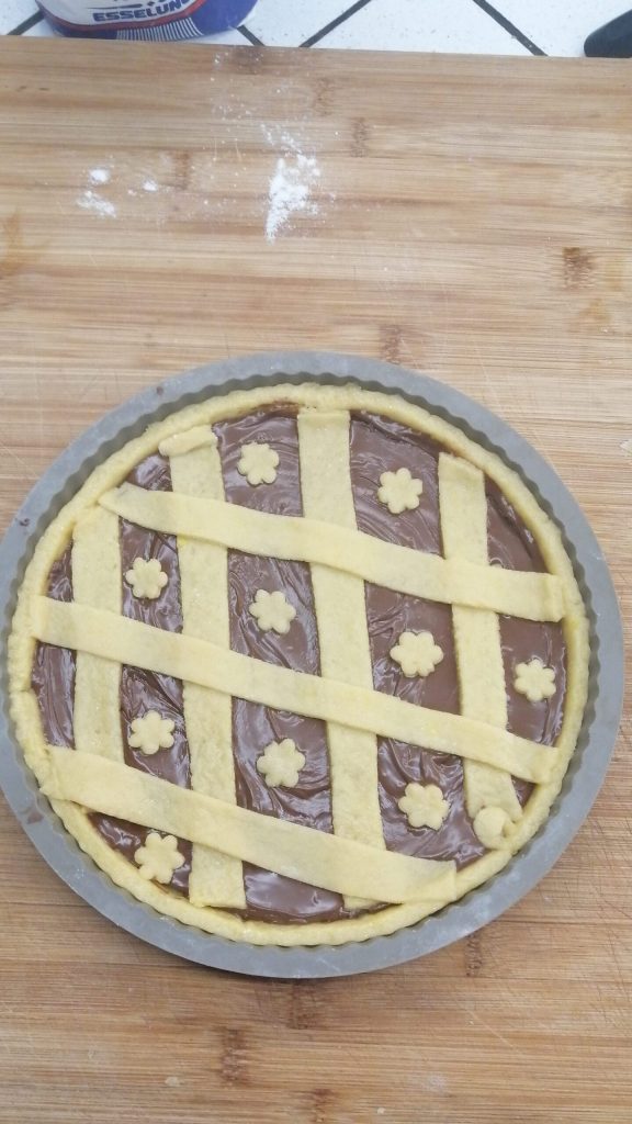 Rol het zanddeeg redelijk dun uit direct op bakpapier. Indien nodig bestrooien met bloem. Leg het deeg in een siliconenvorm of een ingevette en met bloem bestoven vorm, snijd de randen bij met een mes. Vul met de hazelnootcrème of met jam. Maak met het resterende deeg reepjes en leg deze op het oppervlak.