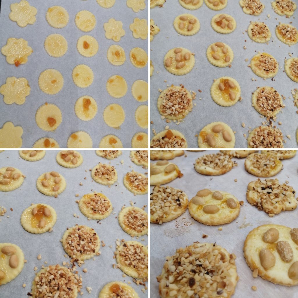 Na deze tijd het deeg nemen en uitrollen met de deegroller op een licht bebloemd werkvlak (ik heb het heel dun uitgerold zoals je op de foto ziet). Vorm vormpjes en leg ze op een met bakpapier beklede bakplaat. Bestrijk met abrikozenjam en leg er voorzichtig gehakte noten of pinda’s op.