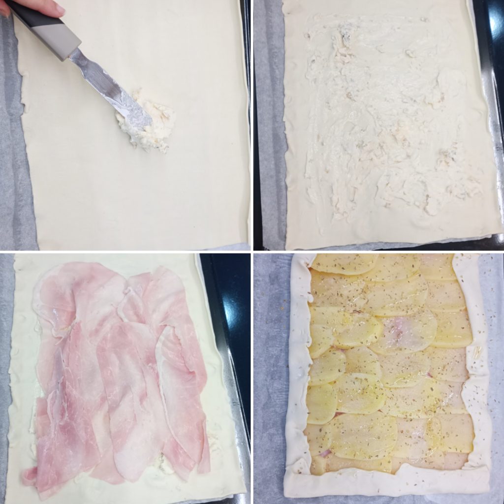 Een krokante bladerdeegbodem, dun gesneden aardappelen, gekookte ham en, als kers op de taart, dat romige vleugje gorgonzola dat alles perfect samenbrengt. Het is een smaakexplosie.