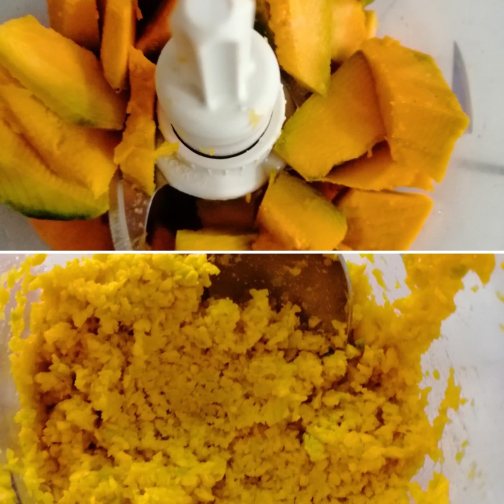 • Allereerst, pureer de rauwe pompoen in kleine stukjes gesneden in een mixer, totdat het een fijne puree wordt.