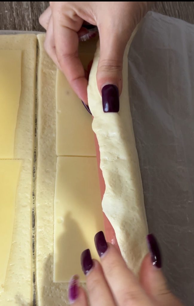 Voeg op elke strook deeg twee plakjes kaas toe.