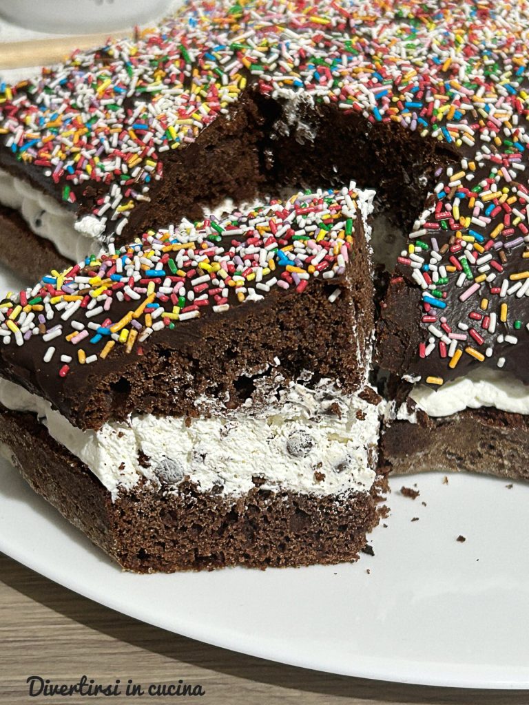 Bereid intussen de vulling. Klop de slagroom met de elektrische mixer, voeg dan de chocoladedruppels toe en meng voorzichtig met een spatel met zachte bewegingen van onder naar boven om het mengsel niet te laten inzakken. Zet even apart.