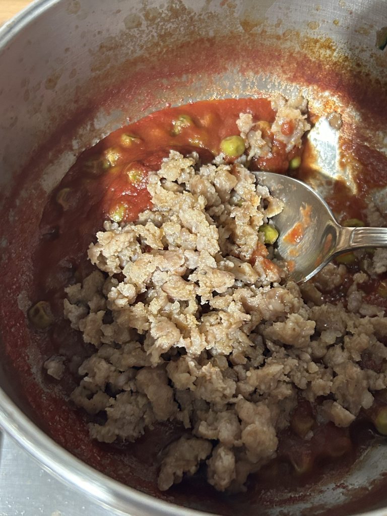 Wanneer de worst goed goudbruin is, voeg deze dan toe aan de saus met de erwten. Meng alles goed.