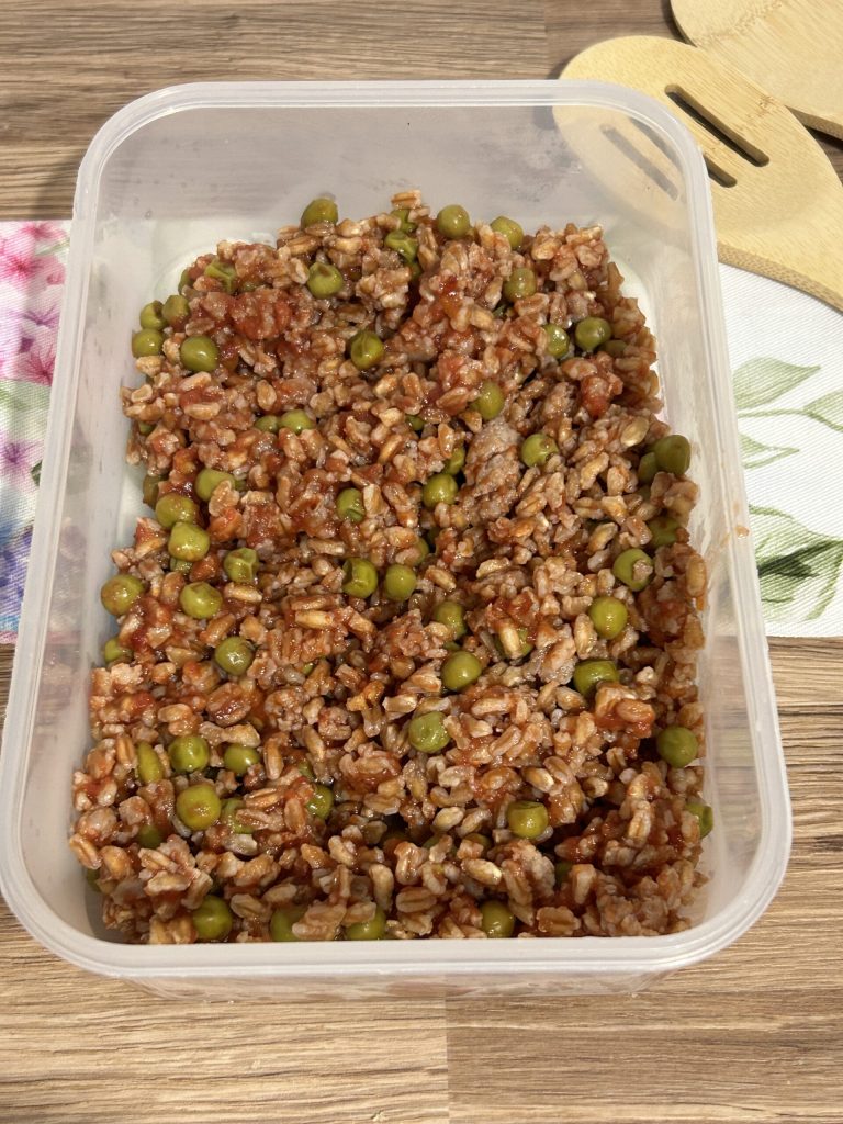 Spelt met erwten en worstje, een gemakkelijk idee voor de lunch op het werk. Een smakelijk en heerlijk gerecht voor de lunchpauze.