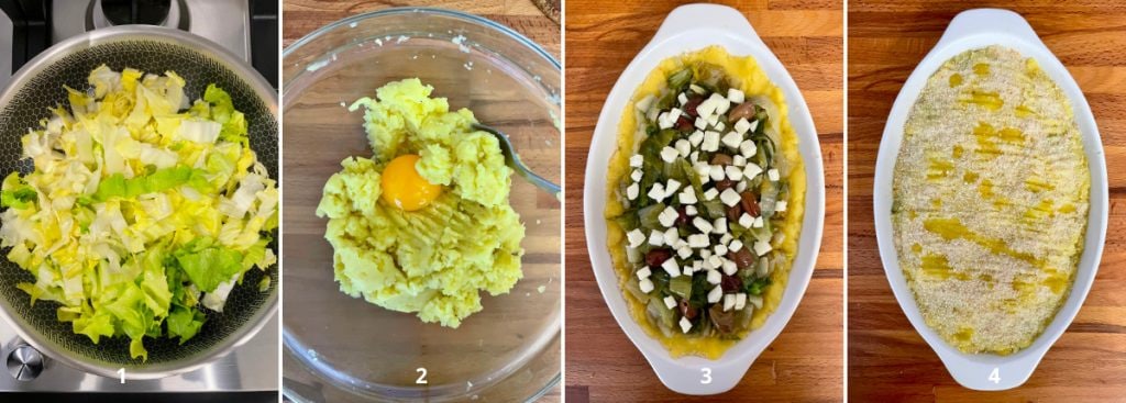 Voeg de in de pan gebakken andijvie met olijven en de in blokjes gesneden provola toe (3).