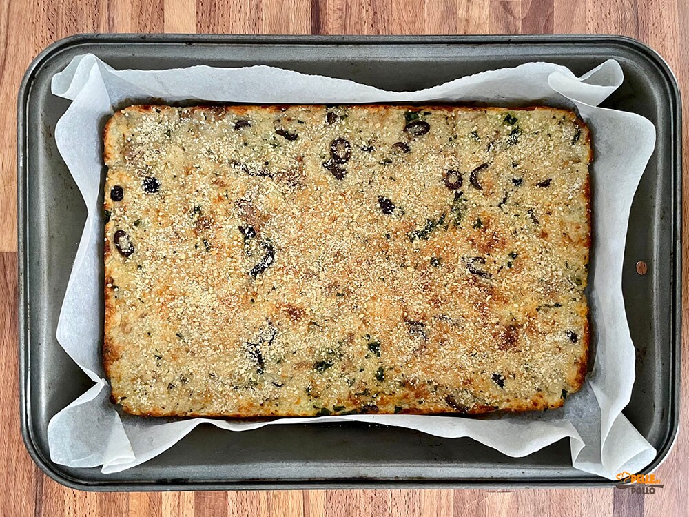 Bekleed een bakvorm met bakpapier en verdeel het mengsel erin, maak het glad met de handen. Smeer de oppervlakte in met extra vergine olijfolie en strooi er wat paneermeel over (3).