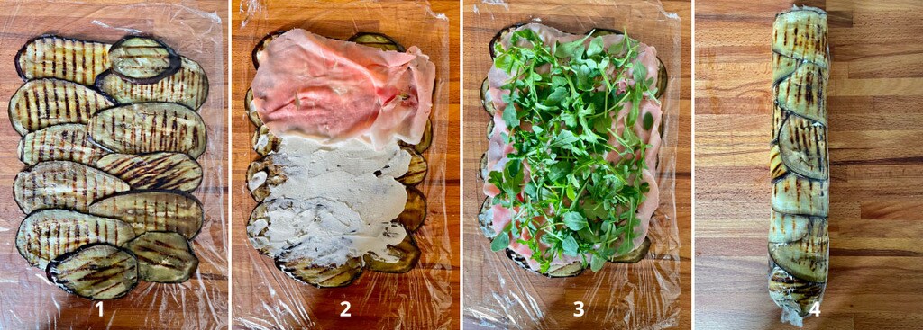 Koud auberginerolletje, een eenvoudig, snel en licht recept, perfect voor de zomer! Een simpele basis van gegrilde aubergines, gevuld met de ingrediënten die je verkiest. In mijn geval koos ik voor roomkaas, gekookte ham en rucola… maar je kunt naar wens variëren, aan het einde van de bereiding vind je enkele suggesties. Het gegrilde auberginerolletje is uitstekend als voorgerecht, maar kan ook als hoofdgerecht worden geserveerd in grotere porties. Om regelmatige plakken te snijden die niet uit elkaar vallen, laat je het rolletje minstens een uur in de koelkast rusten zodat het goed compact wordt. Probeer het recept, want het is echt heel lekker!
