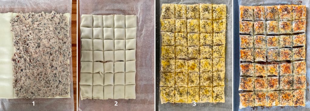 Vouw de andere helft eroverheen en druk lichtjes aan. Snijd met het wieltje vierkantjes van gelijke grootte zonder ze van elkaar te scheiden (2), zodat ze niet “open” gaan tijdens het bakken. Ik heb er 35 gemaakt, maar je kunt ze ook iets groter maken, of in rechthoekige vorm.