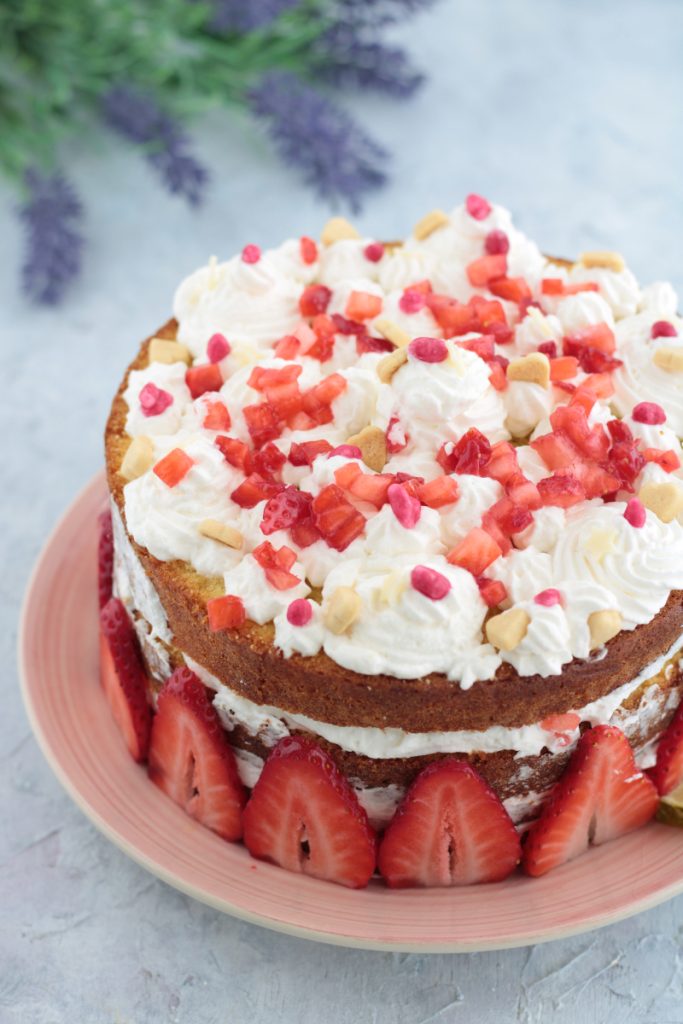 Deze versie is ook heerlijk omdat hij superzacht is, en gevulde met slagroom en aardbeien wordt hij nog smakelijker.
