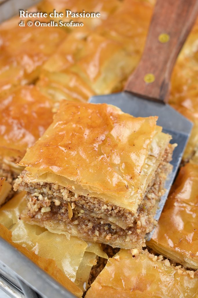 Baklava, zoet gebak met filodeeg, honing en kaneel, het typisch Turkse dessert dat veel voorkomt in de Midden-Oosterse keuken maar ook op de Balkan en in Centraal-Azië; ik ontdekte het in Griekenland. Een geurig dessert met kaneel en filodeeg (ik gebruikte kant-en-klaar deeg) en veel noten, bijeen gehouden door een siroop met honing en sinaasappel, wat het dessert echt bijzonder maakt. Ik zal eerlijk zijn: de eerste keer dat ik het proefde vond ik het niet lekker, voor mijn smaak was het echt te zoet en misschien ook te veel kaneel. Maar toen ik het een tweede keer op een andere plek proefde, vond ik het bijna aangenaam; na jaren vakantie in Griekenland maakte ik zelf baklava, een huiselijke versie die ik minder zoet en aangenamer vond, beslist minder zoet dan die versie in Griekenland, en daarom voor mij veel lekkerder. Hier laat ik mijn versie achter; ik hoop dat hij jullie ook bevalt. Ik werd er verslaafd aan en at elke ochtend een stukje; gelukkig blijft het heel goed houdbaar dankzij de hoeveelheid siroop.