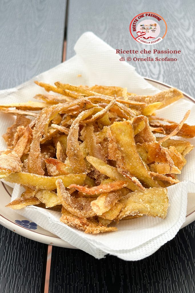 Chips van aardappelschillen, super knapperig en echt heerlijk, ik heb ze gefrituurd, ze zijn echt lekker, maar als alternatief kunnen ze snel in de magnetron worden gemaakt, lichter en zonder frituren, of in de airfryer, of zelfs in de oven. Vorige zondag had ik mijn schoonzus als gast voor de lunch, ik had een uitgebreid menu klaargemaakt met polenta vlees champignons en ik had ook een bijgerecht van paprika en aardappelen uit de oven, en een lekker dessert, een heerlijke ricotta taart, maar het leek alsof ik weinig had gedaan dus dacht ik eraan om aardappelchips als voorgerecht te maken, maar aangezien ik al aardappelen uit de oven had gemaakt, heb ik de schillen gebruikt om ze niet te verspillen en om te vermijden dezelfde aardappelen in 2 verschillende recepten te bereiden. Zo is het idee ontstaan om niets van de heerlijke aardappelen te verspillen en ook de schillen te gebruiken door knapperige en smaakvolle aardappelschijfjes met schil te bereiden.