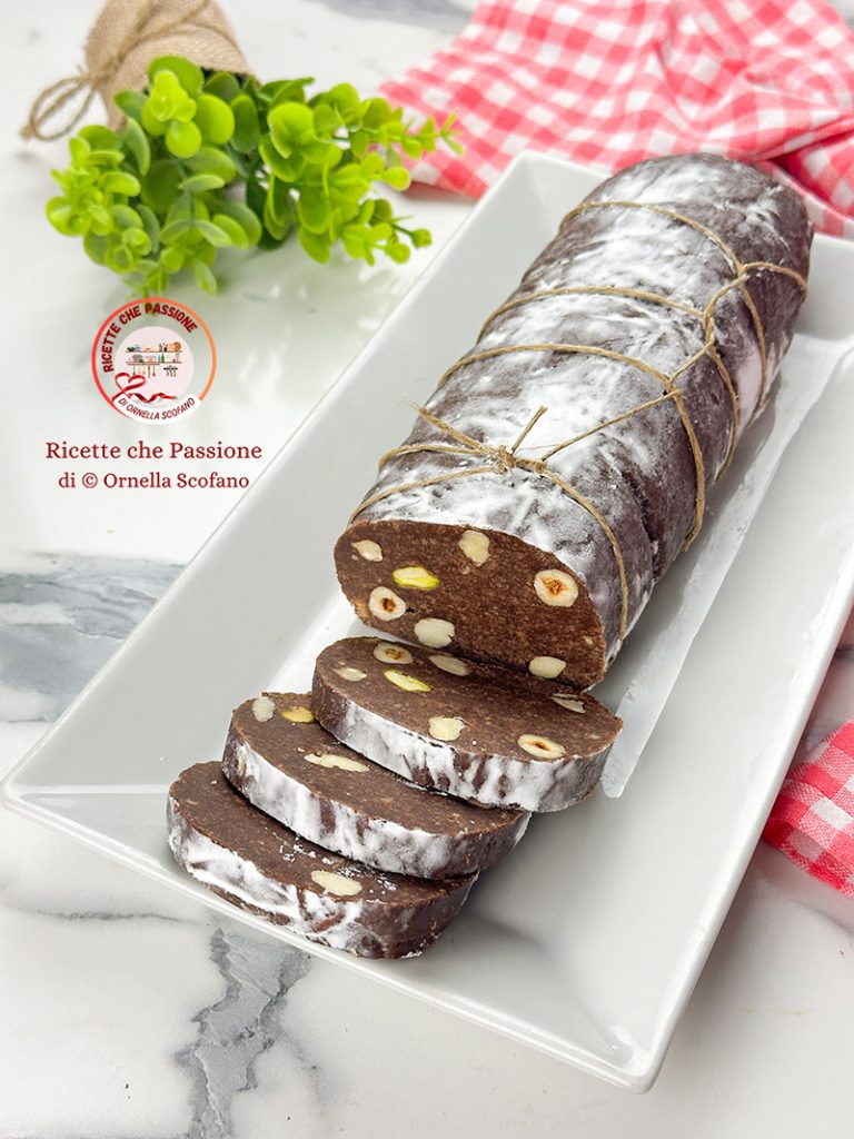 Chocoladesalami bereid zonder boter met gecondenseerde melk en gedroogd fruit, gearomatiseerd met kaneel en amaretto, gemakkelijk te maken en het is letterlijk populair, het heeft immers een nadeel, het maakt verslaafd. Het bereiden van de chocoladesalami met gecondenseerde melk is heel eenvoudig, en vereist weinig ingrediënten, een basis van koekjes, gemalen en verwerkt samen met gecondenseerde melk, gesmolten chocolade en likeur, in mijn geval amaretto. Ik heb een goede amaretto smaak toegevoegd, maar een andere likeur, zoals rum of sinaasappellikeur, is ook goed. Ik heb ook veel cacao en kaneel toegevoegd om het een intensere smaak te geven, en ik moet zeggen dat de keuze een schot in de roos was, achteraf gezien had ik wat gekonfijte sinaasappelschil kunnen toevoegen, die ik thuis maak en heerlijk zijn, ze zouden perfect zijn geweest in het geheel, jammer dat ik er niet eerder aan gedacht heb.