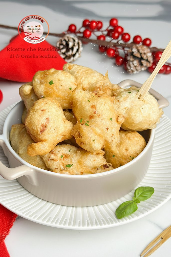 Crispelle van kabeljauw, smaakvol en gemakkelijk te bereiden, perfect voor de feestdagen. Het kost slechts een paar minuten om het perfecte deeg te bereiden, met veel kabeljauw voor een echt heerlijke smaak. Crispelle zijn een klassieker tijdens de kerstperiode in Calabria. We maken ze in de vorm van een donut, langwerpig of als balletjes, afhankelijk van hoe ze worden bereid. Ze worden meestal gevuld langwerpig of met andere ingrediënten als balletjes, en als lege donuts. Ze worden bereid met een eenvoudig deeg van bloem, water en gist of met deeg van bloem, water en aardappelen. Elke plaats heeft zijn eigen versie. Vandaag stel ik een snel recept voor zonder aardappelen, maar er is niets dat je ervan weerhoudt om ze toe te voegen. Ze worden fijn geplet toegevoegd, na het koken, terwijl ze nog heet zijn, in een halve dosis ten opzichte van de bloem, en men regelt dan beetje bij beetje het watergebruik om een vrij stevig deeg te krijgen, steviger dan zonder aardappelen omdat het tijdens het rijzen zachter wordt. Dit is belangrijk om te voorkomen dat het deeg te vloeibaar is, anders absorbeert het olie tijdens het koken. Laten we eens kijken hoe we ze kunnen bereiden.