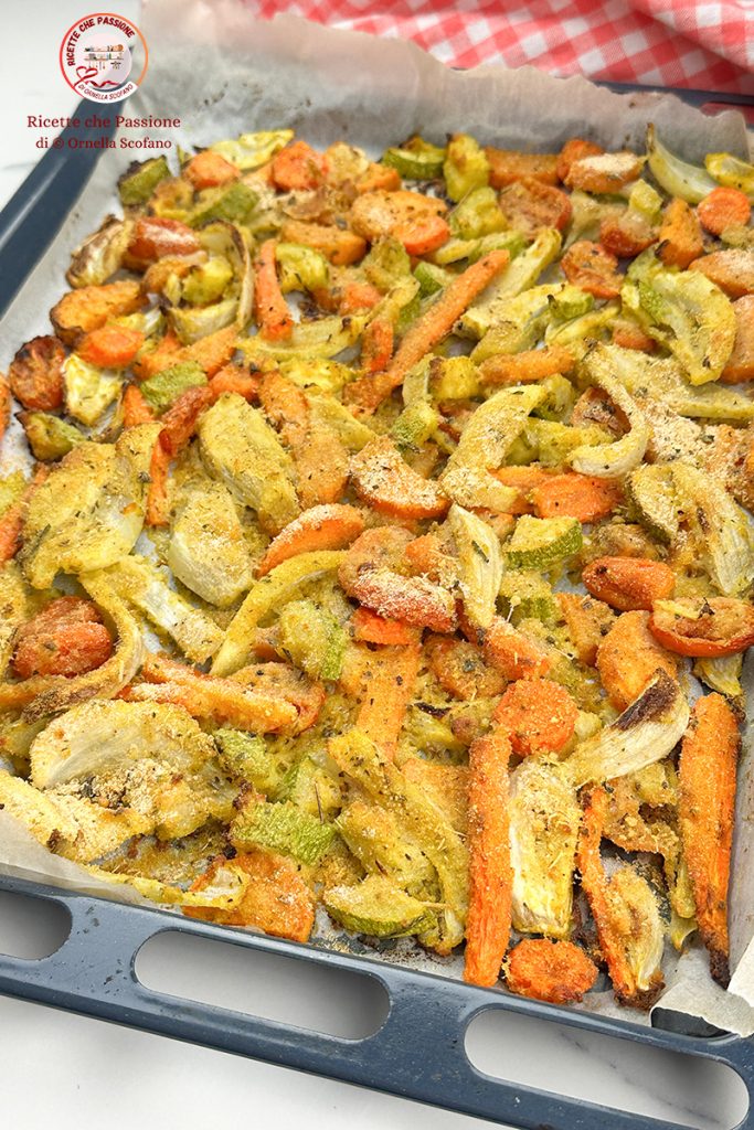 Gegratineerde gemengde groenten uit de oven, een snel en smakelijk recept om de koelkast leeg te maken. Kortom, eerlijk gezegd moest ik een groentegerecht voor maar liefst 8 personen bereiden, maar ik had niet zoveel dezelfde groenten in huis om een overvloedig bijgerecht voor iedereen te maken. Dus kwam ik op het idee om alle groenten die ik aan het einde van de week in de koelkast over had, op een bakplaat te leggen. Ik had een venkel – 5 wortelen – een courgette – een mooie zoete aardappel en wat overgebleven cherrytomaatjes die ik altijd in mijn koelkast heb, dus hier is mijn bakplaat met gegratineerde gemengde groenten uit de oven. Ik maakte ze snel, op het laatste moment, vlak voor het avondeten, dus ik dacht er zelfs niet aan om de bereiding vast te leggen, maar voordat ik ze op een mooie serveerschaal zette, dacht ik eraan om een paar foto’s te maken, beroepsdeformatie. Toen ik ze op tafel zette, werden ze letterlijk bestormd, iedereen nam nog een portie en blijer dan ooit gaf ik het recept aan mijn gasten die ondertussen het recept aan mij vroegen, dus hier ben ik, ik geef het ook aan jullie, ik ben er zeker van dat jullie het lekker zullen vinden, en ja, ik denk dat ik het snel nog een keer maak zodat ik ook het videorecept voor jullie kan maken, al is het echt heel makkelijk. Uiteraard kunnen er ook andere groenten worden toegevoegd, zoals broccoli en bloemkool, pompoen, ui, aardappelen.