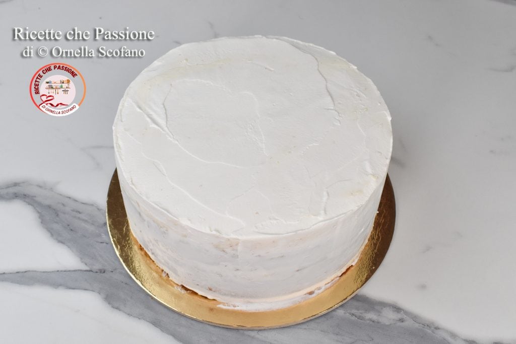 • We kloppen de room om onze taart te bedekken. We hebben ongeveer 80-100 g nodig voor een dunne laag, een beetje gebruiken we om te decoreren met de spuitzak. We kloppen het altijd koud uit de koelkast. Met de room bedekken we de hele taart, de zijkanten en het oppervlak.
