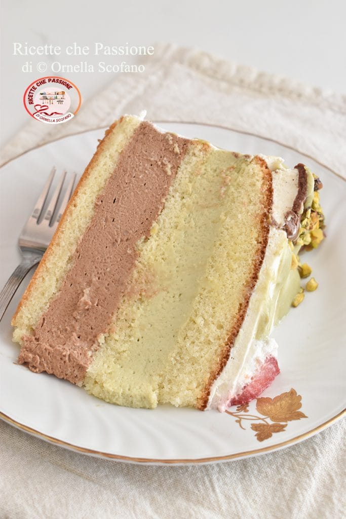 • Dek af met de tweede schijf, besprenkel en dek af met de pistachecrème. Dek af met de derde schijf, besprenkel en dek af met de vanillecrème. Wikkel in plasticfolie en vries in, zo wordt decoreren eenvoudiger. We kunnen het ook van tevoren zo bereiden en ontdooien op de dag dat het wordt geserveerd of de dag ervoor, belangrijk is dat het nog bevroren wordt gedecoreerd.