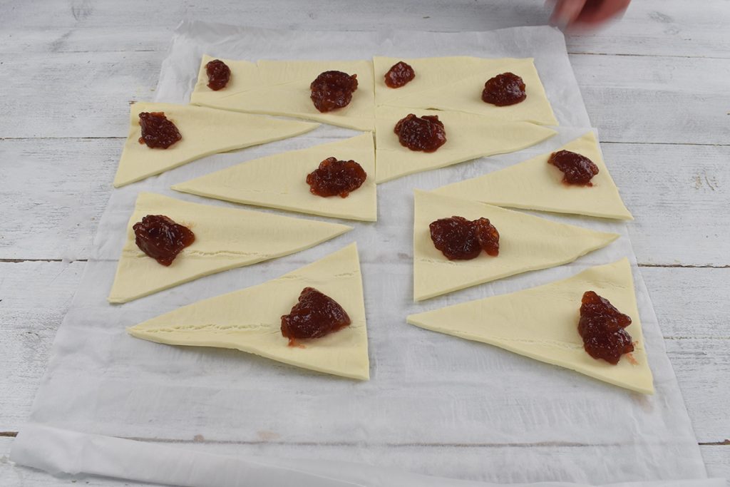 Vul elke driehoek aan de basis met een halve theelepel aardbeienjam of wat je maar wilt, ook met nutella als je gulzig bent, of misschien met een hartige vulling voor een lekkere aperitief. Gebruik minder vulling op de kleinere driehoeken, zodat je de vulling goed kunt afsluiten.