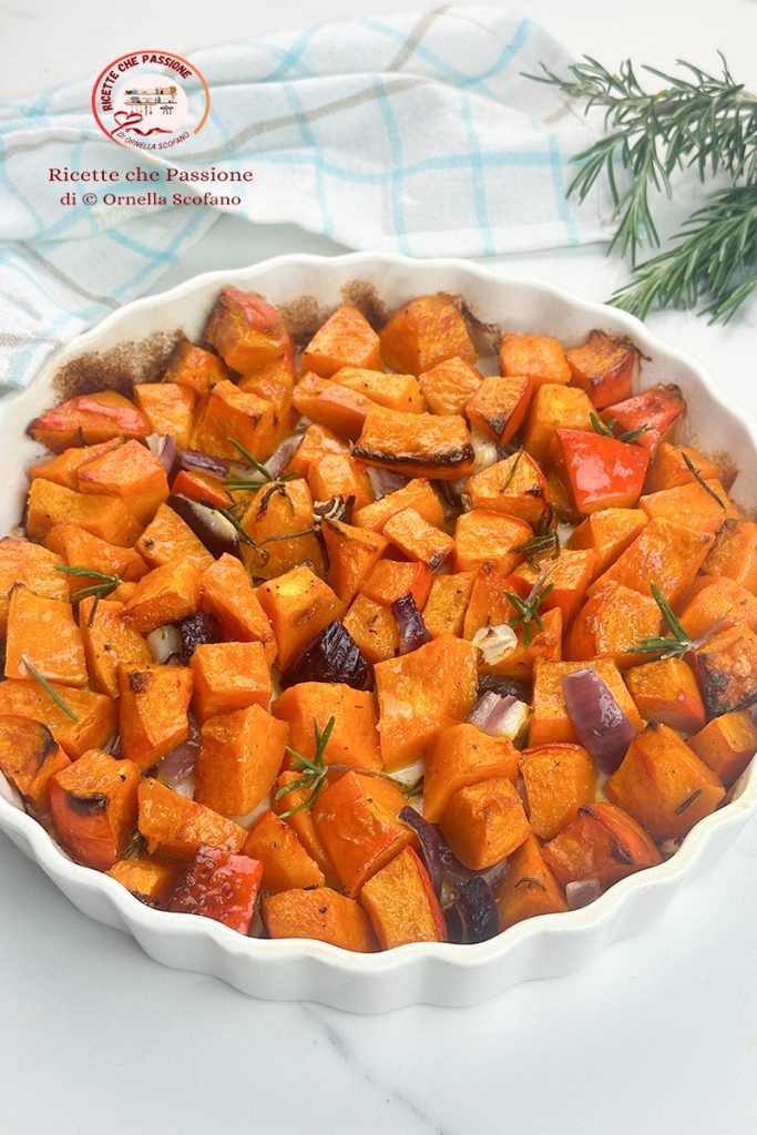 Geroosterde pompoen met ui en rozemarijn, eenvoudig en heerlijk, voor het recept heb ik de Hokkaido-pompoen gebruikt, een pompoen met een intense, zoete en aromatische smaak, perfect om ook met de dunne schil te consumeren. In plaats van de Hokkaido-pompoen kun je ook andere soorten gebruiken, zoals de delica, de butternut of de violina, maar ook andere soorten zullen perfect zijn. Uitstekend in de oven omdat het bijna zonder enige moeite gaart, je hoeft het alleen maar te snijden, kruiden en in een ovenschaal te leggen. Om de smaak te versterken voeg ik graag zwarte peper en rozemarijn toe, deze keer heb ik ook een kleine rode Tropea-ui toegevoegd, grof gesneden om niet te verbranden, en laat me je vertellen, het is gewoon heerlijk, binnen een half uur was het al klaar om van te genieten. Hier is mijn verzameling van recepten met pompoen.