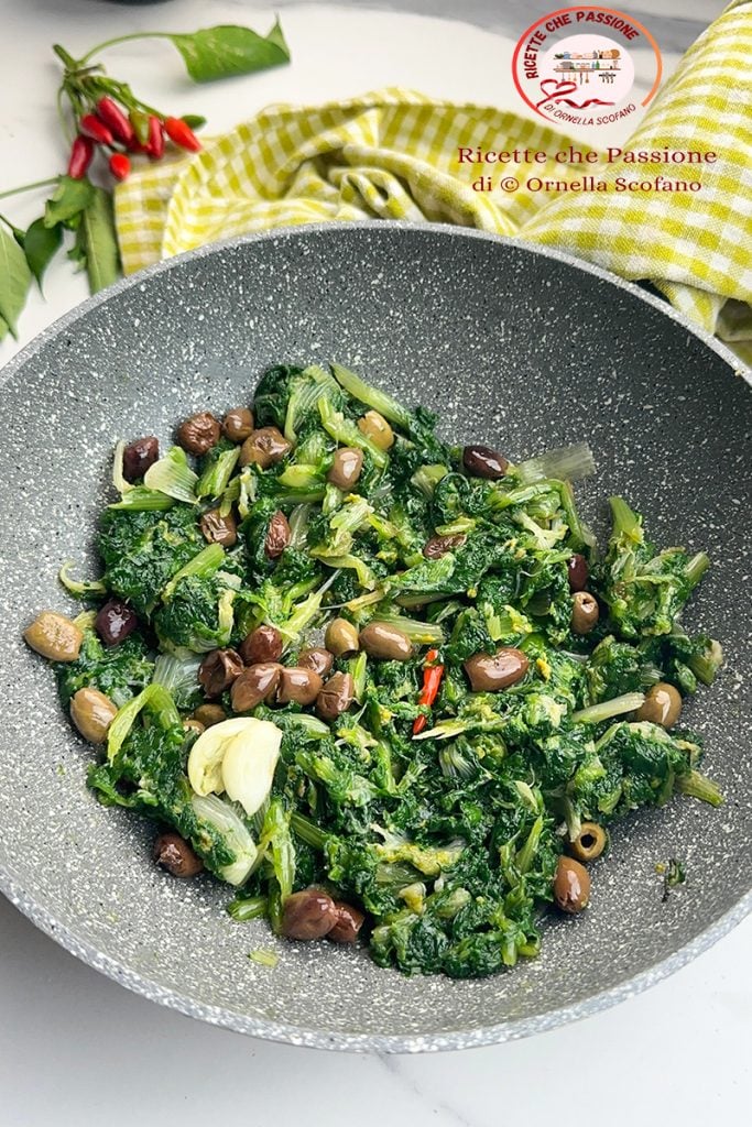 De gesmoorde andijvie is een smakelijke bijgerecht om bijna het hele jaar door van te genieten, omdat andijvie het hele jaar verkrijgbaar is. Heerlijk na het kort koken om het zachter te maken, gesmoord in de pan met knoflook, olie en peperoncino. En voor nog meer smaak kun je er een hoop ontpitte of beboten olijven aan toevoegen, wat het nog smakelijker maakt. Je kunt eventueel rozijnen, pijnboompitten of zelfs paneermeel toevoegen, maar vandaag wil ik het simpel houden met alleen olijven, wat trouwens ook geweldig is als vulling in een heerlijke gevulde andijviepizza.