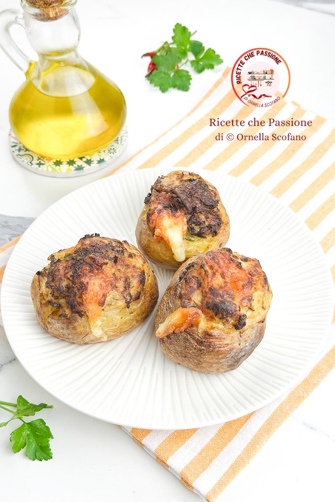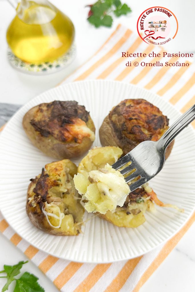 Gevulde aardappelen met champignons en provola, heerlijk en snel in de airfryer, een explosief recept dat je in een paar minuten kunt maken, omdat het een explosie van smaken is die je sprakeloos achterlaat. Stel je niet voor hoe lang ik al van plan was ze te maken, en ik stelde het uit omdat het tijd kost om de aardappelen te koken en in de oven te bakken. Dus besloot ik onlangs om het anders te doen, zonder de gebruikelijke stappen van eerst koken en dan bakken in de oven. Ik bedacht een snellere manier. Ik kookte de aardappelen eerst in de magnetron, voor 4 grote aardappelen ongeveer 10 minuten op 1200 watt. Ondertussen bereidde ik 2 gebakken champignons voor de vulling en voor ik het wist, waren mijn gevulde aardappelen klaar om in de oven te gaan. Maar toen bedacht ik dat ik de airfryer kon gebruiken, en dat deed ik. Ik bakte ze 15 minuten in de airfryer en mijn heerlijke geroosterde gevulde aardappelen waren klaar om te proeven. Ik liet ze met de schil, wat volgens mij het beste deel is met het korstje bovenop, hoewel ik moet toegeven dat de vulling ook fantastisch was. Dus wat zeg je ervan, maak ze met mij en probeer ze, ze zijn geweldig.