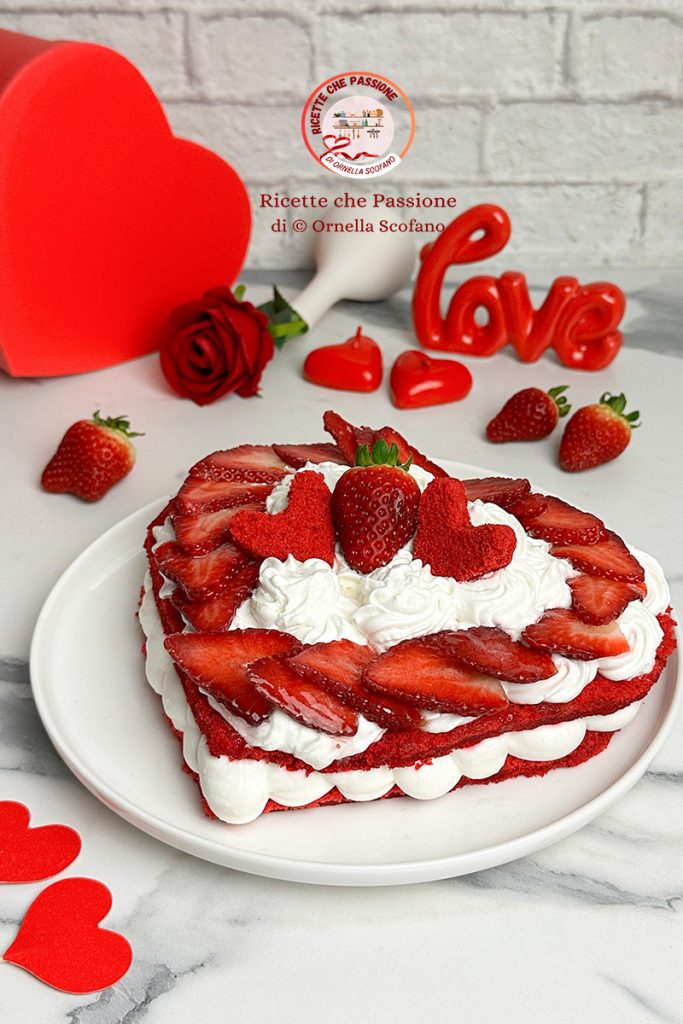 Hartentaart zonder vorm voor Valentijnsdag, makkelijk en snel, echt heerlijk met een basis van red velvet biscuitdeeg gemaakt met weinig en eenvoudige ingrediënten, zacht en smeltend, zonder vetten en zonder gist. Ik besloot om het een beetje te bedruppelen om de basis te parfumeren, maar het is niet eens nodig, ik koos voor een alchermes siroop. Voor de vulling een snelle crème met schapenricotta en slagroom, en voor decoratie, die echter niet alleen decoratief zijn, maar veel smaak en geur geven, verse aardbeien. Ik moet bekennen dat ik ze voor de eerste keer dit seizoen echt heerlijk vond, zoet en smakelijk. Ik besloot om deze taart voor Valentijnsdag te maken, de 14e februari, het feest van alle geliefden, komt steeds dichterbij, maar het is zo makkelijk en lekker dat het ook voor veel andere gelegenheden gemaakt kan worden, zelfs als verjaardagstaart, je kunt hem rood maken, of zonder kleurstof, in de vorm van een hart, of zelfs een eenvoudige cirkel of nummer, gebruikmakend van een geschikte mal, ik maakte een hart door het op een A4-vel te tekenen dat ik vervolgens doormidden vouwde en met de schaar uitsneed. Ik legde het vel op de basis en sneed het uit met een mes. Makkelijk toch? Laten we het samen maken.